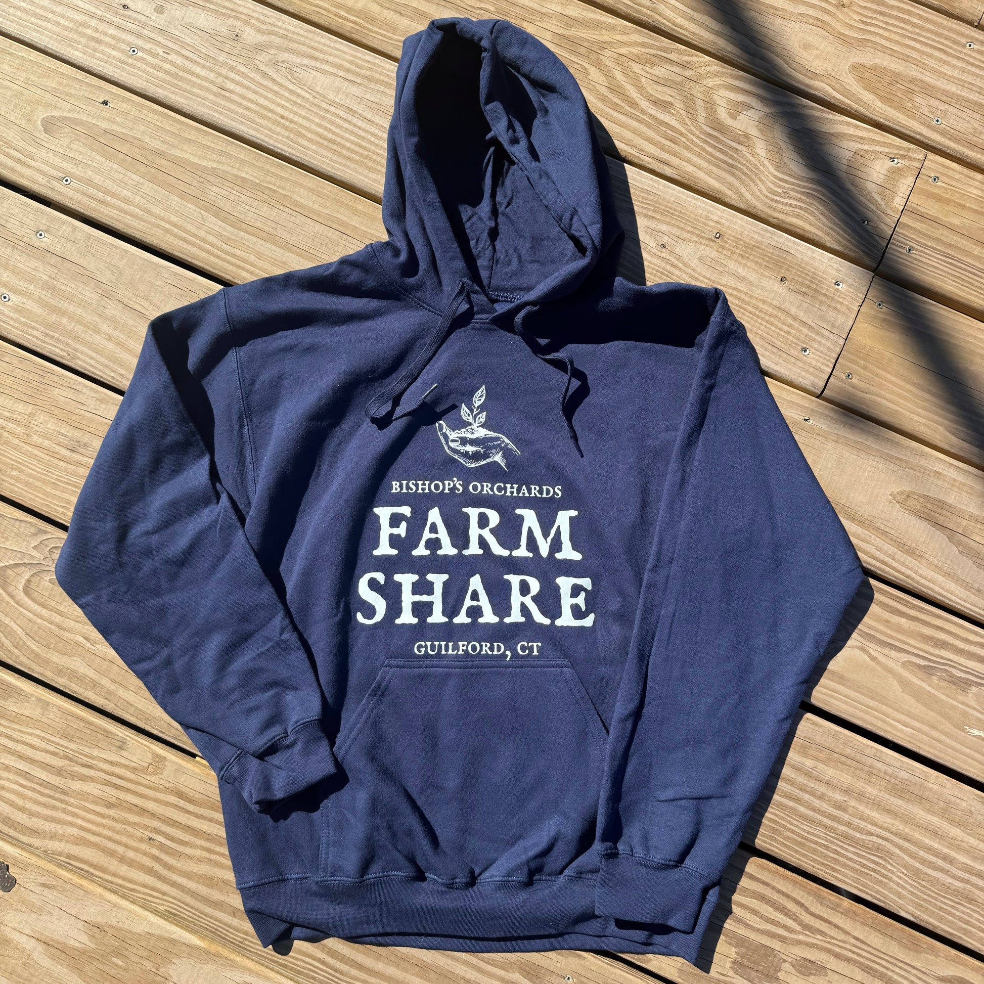 Heavy weight cotton-blend hooded sweatshirt in true navy blue with Farm Share logo on front. Available in sizes S-3XL.